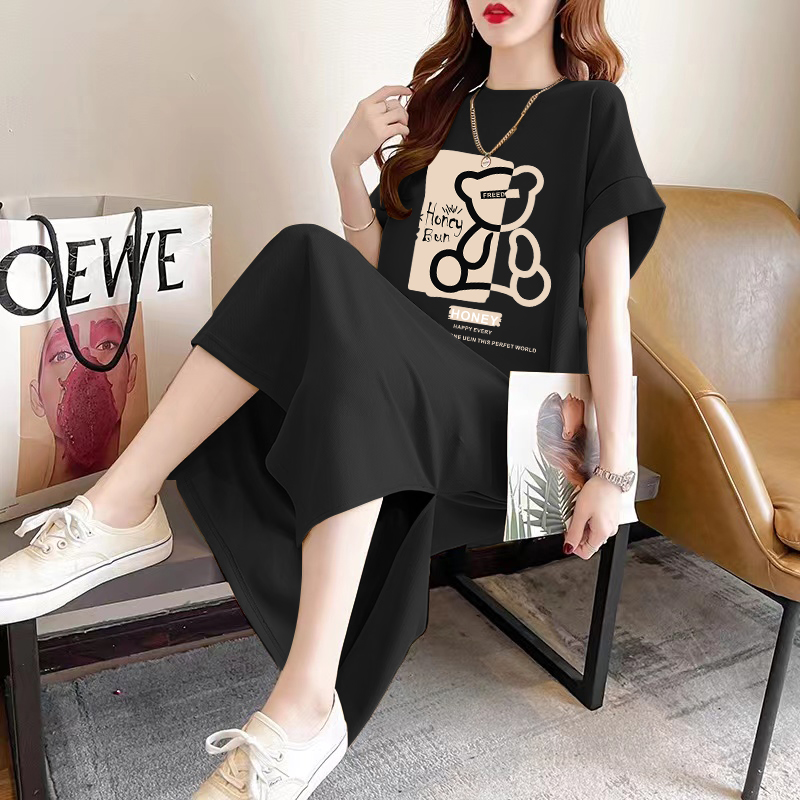 15分鐘前慵懒风短袖t恤裙女夏季休闲宽松过膝长裙纯棉长款连衣裙大码女装 - 黑色套裝